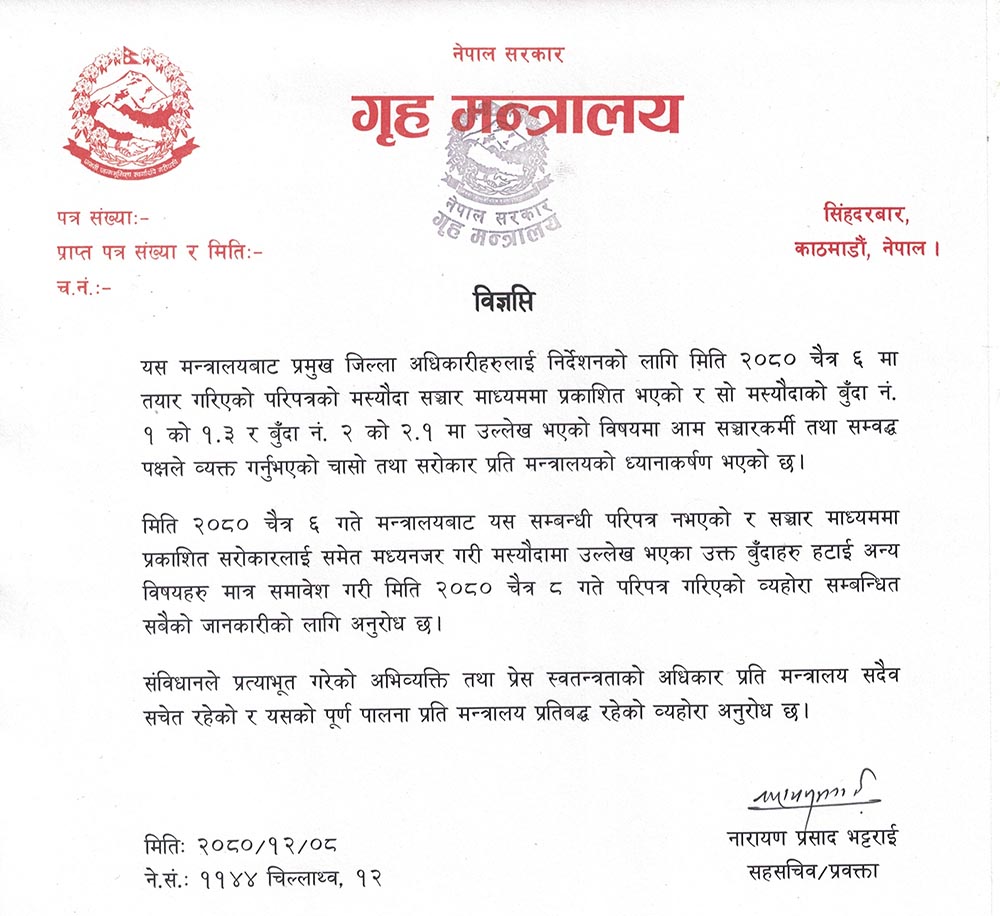 गृह मन्त्रालयले विहिबार यसअघि चैत्र ६ मा तयार गरिएको परिपत्रको मस्यौदालाई सच्याएर परिपत्र गरिएको जानकारी दिएको छ । यसअघि पठाइएको २१ बुँदे निर्देशनको दुई नम्बर बुँदामा सामाजिक सञ्जालको मर्यादित प्रयोग र साइबर अपराध नियन्त्रण सम्बन्धी उल्लेख गर्दै त्यसमा अनलाइन न्युज पोर्टल समेत उल्लेख गरिएको थियो ।