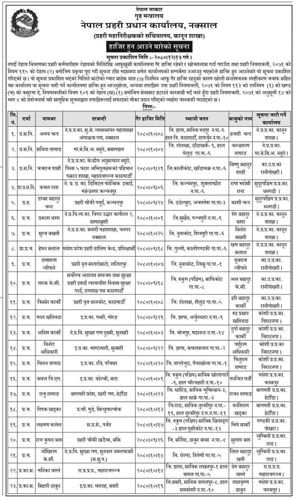 प्रहरी प्रधान कार्यालयले मंगलबार एक सूचना जारी गर्दै खोजतलास गर्दा पनि सम्पर्कमा नआएका २३ जना कर्मचारीलाई ७ दिनभित्र सन्तोषजनक स्पष्टीकरणसहित हाजिर हुन सूचना प्रकासित गरेको हो ।