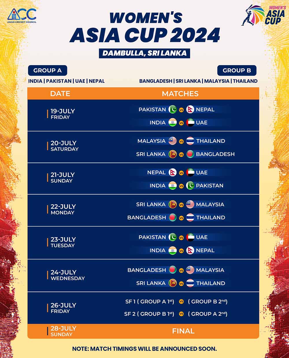 भारत, पाकिस्तान, श्रीलंका र बंगलादेशसहित एसीसीले महिला प्रिमियर कप २०२४ को सेमिफाइनल पुग्ने युएई, मलेसिया, नेपाल र थाइल्याण्डलाई एशिया कप खेल्न दिने निर्णय गरको हो।