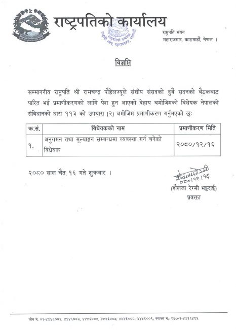 राष्ट्रपति पौडेलद्वारा अनुगमन तथा मूल्यांकन विधेयक प्रमाणीकरण