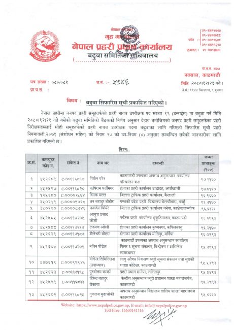यही चैत २१ गते बसेको बढुवा समितिको बैठकले बढुवाका लागि सिफारिस गरेको थियो। सोहीअनुसार बढुवा गरिएको प्रहरी प्रधान कार्यालयले जनाएको छ।
