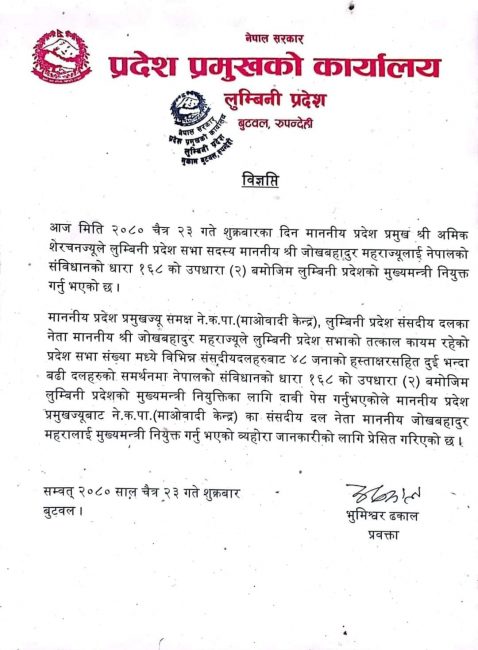 काठमाडौं। लुम्बिनी प्रदेश सरकारको मुख्यमन्त्रीमा नेपाल कम्युनिष्ट पार्टी (माओवादी केन्द्र)का संसदीय दलका नेता जोखबहादुर महरा नियुक्त भएका छन्।