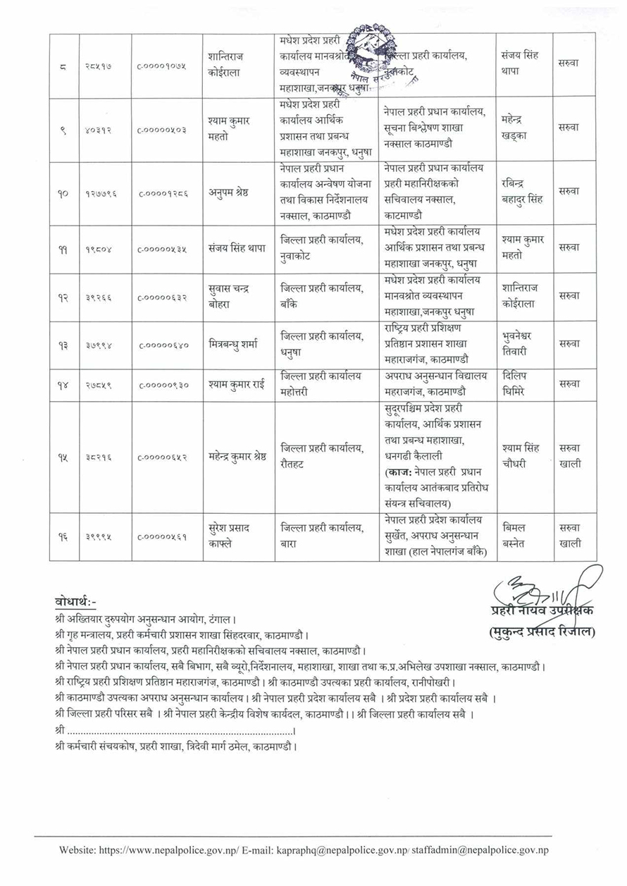 यस्तै बाँकेको प्रहरी प्रमुखमा तुललबहादुर कार्कीलाई पठाइएको छ। सुवास बोहरा रहेको स्थानमा उनलाई विभिन्न बहानामा सरुवा गरिएको छ। सर्लाहीमा केही महिनाअघि गएका दयानीधि ज्ञावालीलाई काठमाडौमा सरुवा गरिएको छ। यस्तै बारा प्रहरी प्रमुखमा एसपी महेन्द्र खड्कालाई ल्याइएको छ भने रौतहट प्रहरी प्रमुखमा एसपी दिलिप घिमिरेलाई पठाइएको छ।