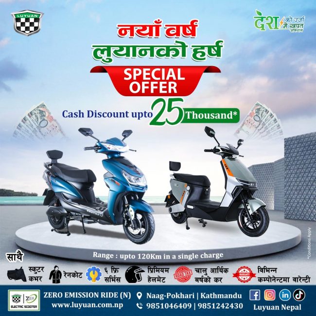 काठमाडौं। लुयान नेपालले सोमबारदेखि लागुहुने गरी नयाँ बर्ष लुयानको हर्ष अफर सँचालनमा ल्याएको छ। यस अफर अन्तर्गत लुयानका विद्युतीय स्कुटर खरिद गर्ने ग्राहकले नगद खरिद गर्दा रु. २५,००० सम्म छुट पाउन सक्नेछन् । लुयानको एमएनके३ र एस३० मा रु. १५,००० र एस७०प्रो मा रु. २५,००० नगद छुट पाउनेछन् ।