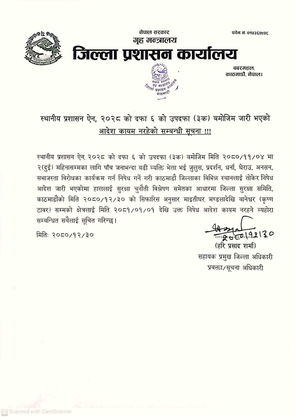 जिल्ला प्रशासन कार्यालय काठमाडौंले आज एक सूचना जारी गर्दै गत फागुन ४ गतेदेखि लागू गरिएको निषेधाज्ञा हटाएको जानकारी दिएको हो। जिल्ला प्रशासन कार्यालय काठमाडौंद्वारा आज जारी सूचनामा भनिएको छ, ‘हाललाई सुरक्षा चुनौती विश्लेषण समेतका आधारमा जिल्ला सुरक्षा समिति काठमाडौंको आजको सिफारिसअनुसार माइतीघर मण्डलादेखि बानेश्वर (कृष्ण टावर) सम्मको क्षेत्रलाई २०८१ वैशाख १ गतेदेखि निषेध आदेश कायम नरहने सबैलाई सूचित गरिन्छ।’