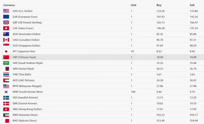त्यस्तै, अमेरिकी डलरको खरिद दर १३३ रुपैयाँ २६ पैसा र बिक्री दर १३३ रुपैयाँ ८६ पैसा रहेको छ । युरो एकको खरिद दर १४१ रुपैयाँ ९२ पैसा र बिक्री दर १४२ रुपैयाँ ५६ पैसा रहेको छ।