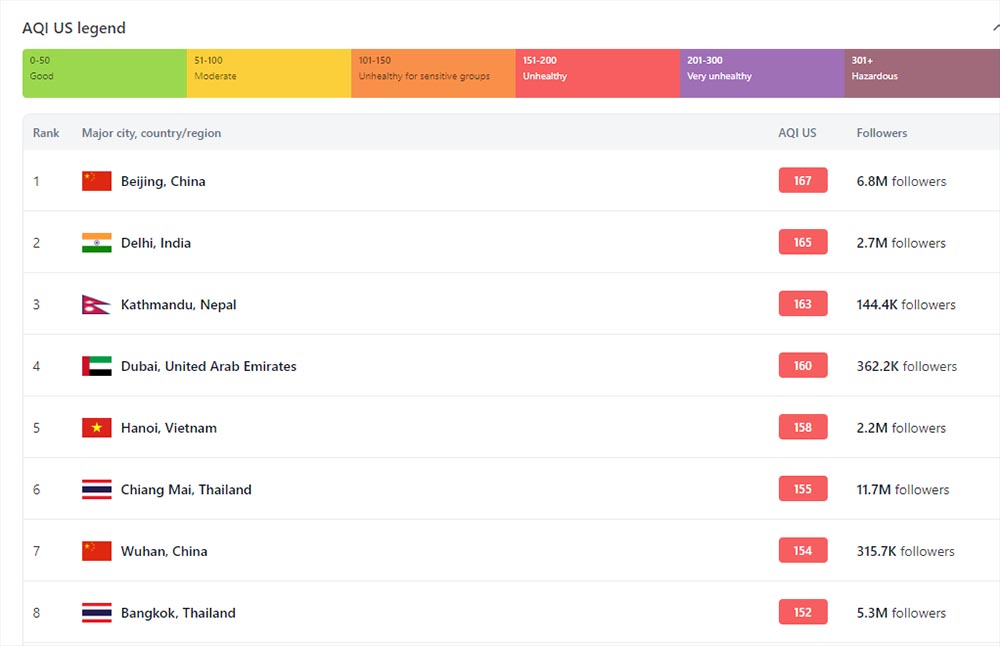 पहिलो स्थानमा १६७ एक्यूआईसहित चीनको बेइजिङ शिर्ष स्थानमा रहेको छ भने भारतको दिल्ली १६५ एक्यूआईसहित दोस्रो स्थानमा रहेको छ । यसलाई स्वास्थ्यको हिसाबले अस्वस्थ मानिन्छ ।