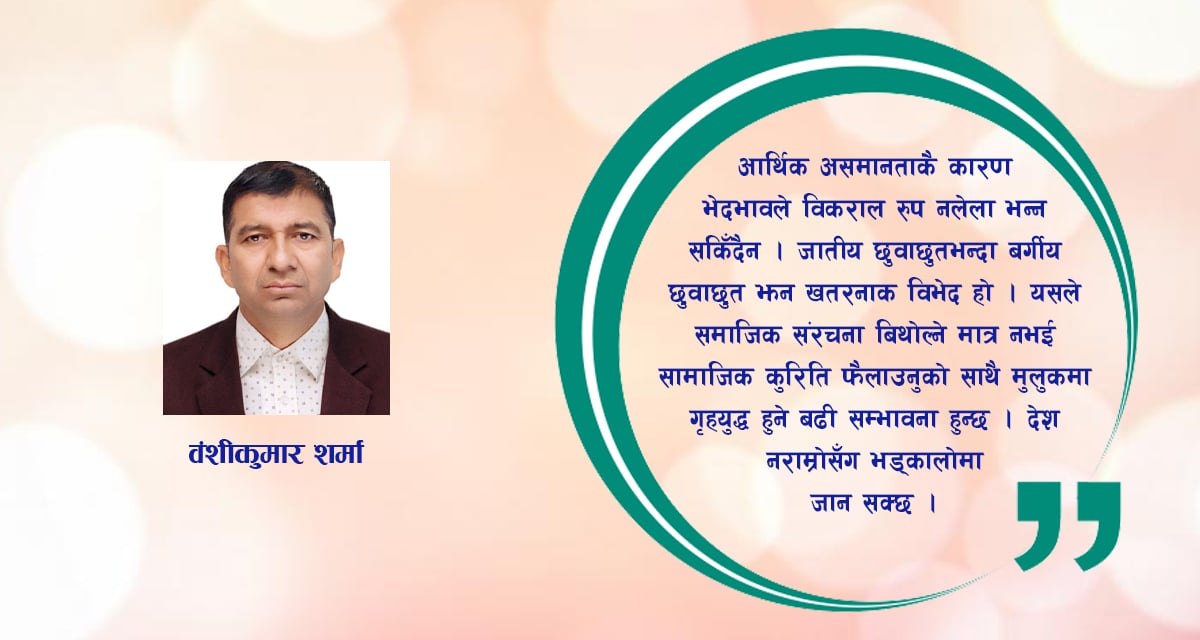 मानिस मानिसबीच देखिएको भेदभाव जातीय विभेद भन्दा वर्गीय विभेद डरलाग्दो छ। आर्थीक असमानता नै प्रमुख कारण हो। वर्गीय असमानताले जटिलता उब्जाउँछ। एक आपसमा गर्ने व्यवहारमा फरक हुन्छ। धनी र गरिबको बीचमा भएको खाडल पूरा नभएसम्म भेदभाव रहिरहने छ।