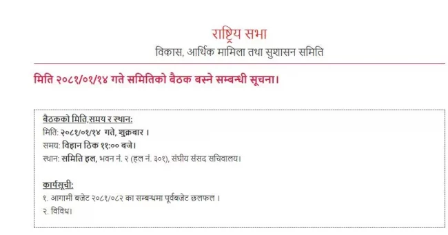 आज विकास, आर्थिक मामिला तथा सुशासन समितिको बैठक बस्दैछ। बैठक सिंहदरबारस्थित संसद् सचिवालयका अनुसार बिहान ११ बजे बस्नेछ।
