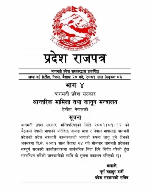 बागमती प्रदेशमा आज सार्वजनिक विदा