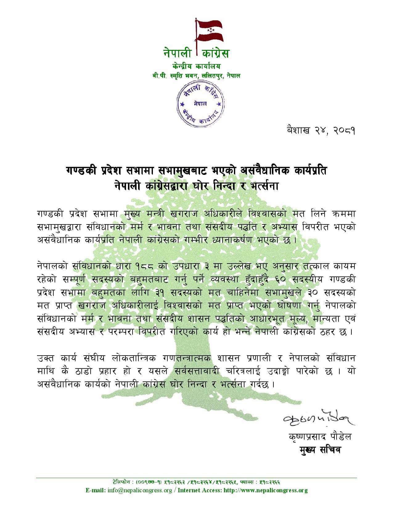 कांग्रेस केन्द्रीय कार्यालयका मुख्यसचिव कृष्णप्रसाद पौडेलले सोमबार विज्ञप्ति जारी गर्दै गण्डकी प्रदेशसभामा मुख्यमन्त्री खगराज अधिकारीले विश्वासको मत लिने क्रममा सभामुखबाट संविधानको मर्म र भावना तथा संसदीय पद्धति र अभ्यास विपरीत भएको असंवैधानिक कार्यप्रति कांग्रेसको गम्भीर ध्यानाकर्षण भएको जनाएका छन्।