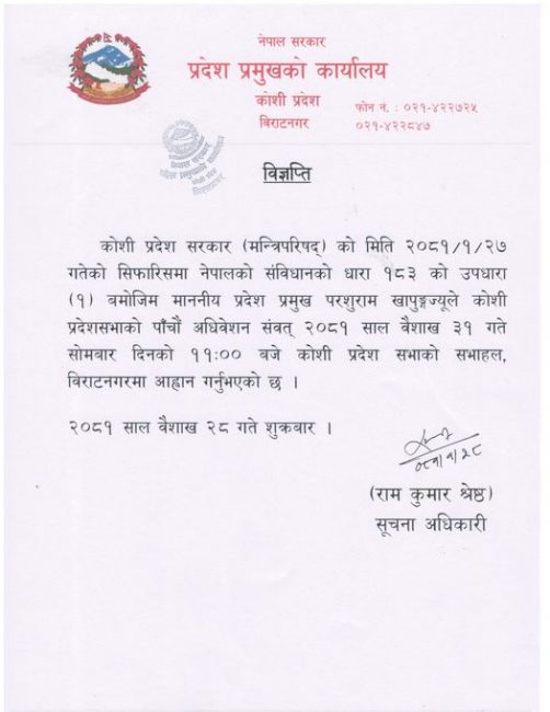 कोशी प्रदेशको बजेट अधिवेशन आह्वान