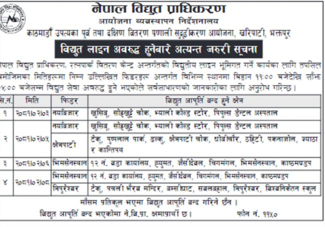 नेपाल विद्युत् प्राधिकरणको रत्नपार्क वितरण केन्द्र अन्तर्गतको विद्युतीय लाइन भूमिगत गर्ने भएकोले उपत्यकाको विभिन्न स्थानमा विद्युत् आपूर्ति अवरुद्ध हुने भएको हो।