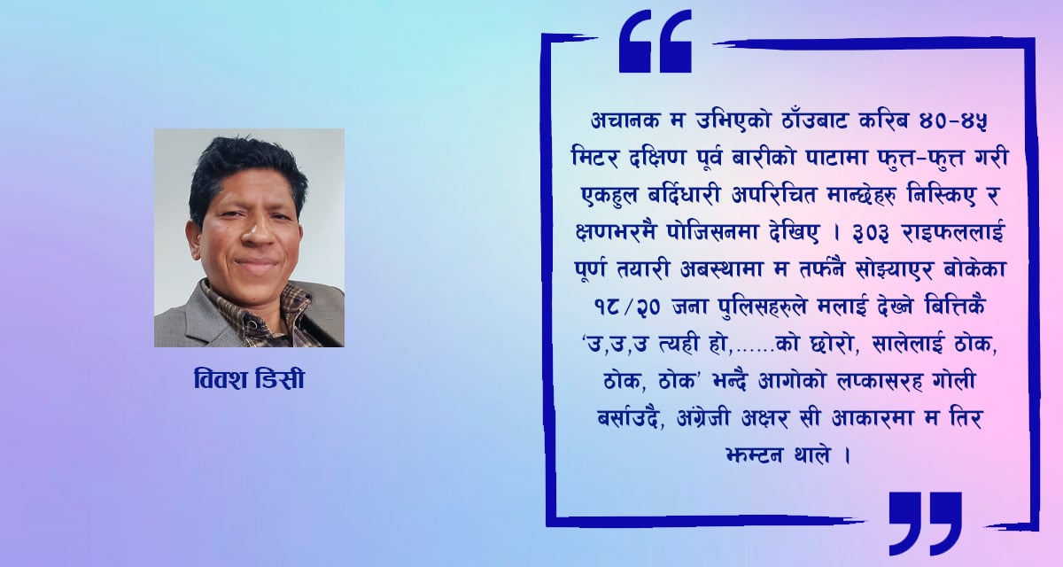 अचानक म उभिएको ठाँउबाट करिब ४०-४५ मिटर दक्षिण पूर्व बारीको पाटामा फुत्तफुत्त गरि एकहुल बर्दिधारी अपरिचित मान्छेहरु निस्किए र क्षणभरमै पोजिसनमा देखिए। ३०३ राइफललाई पूर्ण तयारी अबस्थामा म तर्फनै सोझ्याएर बोकेका १८-२० जना पुलिसहरुले मलाई देख्ने बित्तिकै “उ,उ,उ ! त्यही हो,……को छोरो,सालेलाई ठोक,ठोक,ठोक’ भन्दै आगोको लप्कासरह गोली बर्साउदै, अंग्रेजी अक्षर सी आकारमा म तिर झम्टन थाले।