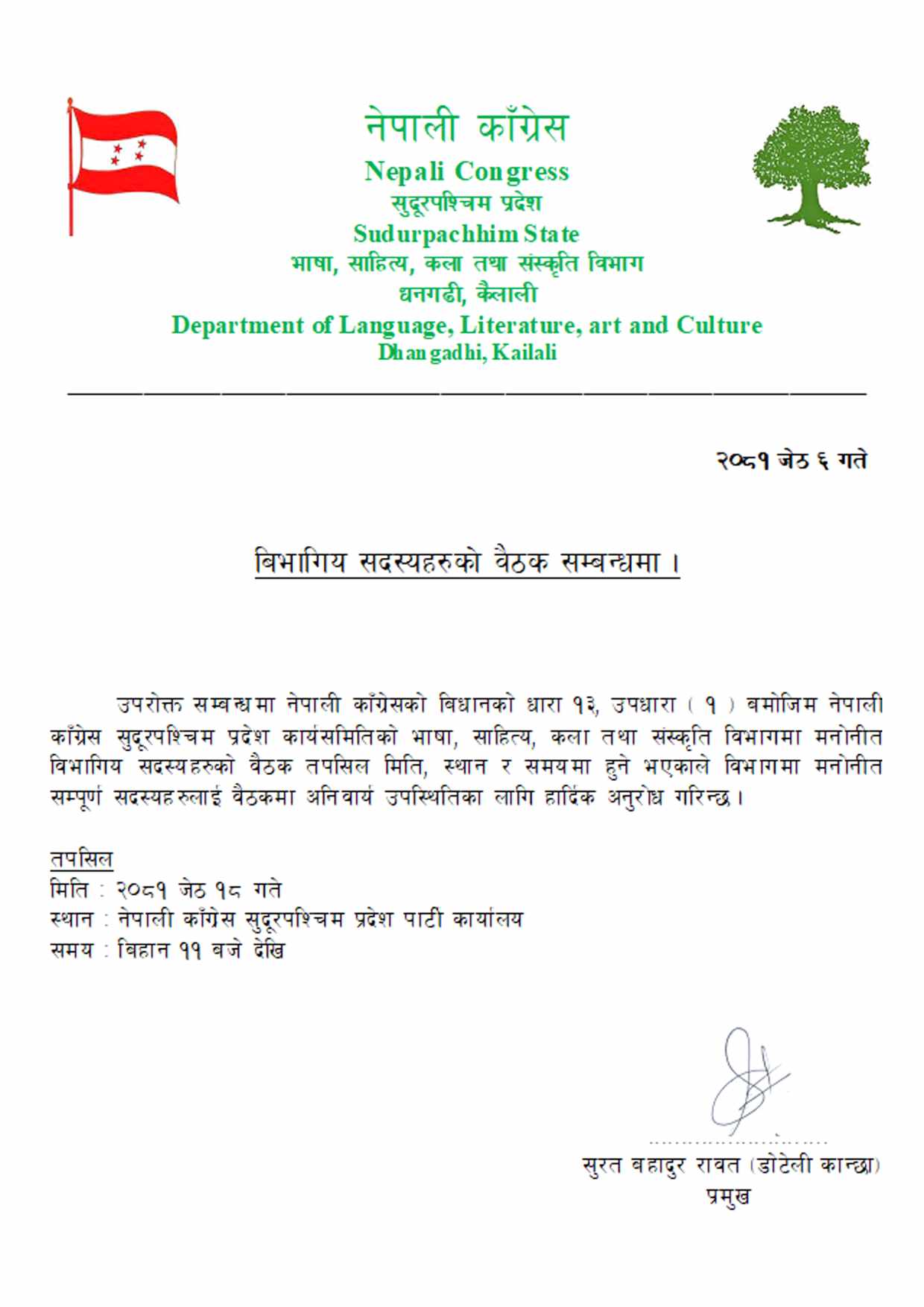 जेठ ६ गते आइतबार विभागका प्रमुख सुरत रावत डोटेली कान्छाले एक वक्तव्यमार्फत नेपाली कांग्रेसको विधानको धारा १३, उपधारा (१) बमोजिम नेपाली कांग्रेस सुदूरपश्चिम प्रदेश कार्यसमितिको भाषा, साहित्य, कला तथा संस्कृति विभागमा मनोनित विभागीय सदस्यहरूलाई बैठकका लागि अनिवार्य उपस्थिति हुन भनिएको छ।