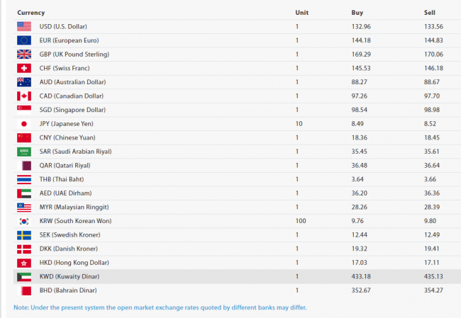 आजको लागि कुवेती दिनार १ को खरिददर ४३३ रुपैयाँ १८ पैसा र बिक्रीदर ४३५ रुपैयाँ १३ पैसा निर्धारण भएको छ। हिजो कुवेती दिनार १ को खरिददर ४३३ रुपैयाँ १२ पैसा र बिक्रीदर ४३५ रुपैयाँ ०८ पैसा थियो।