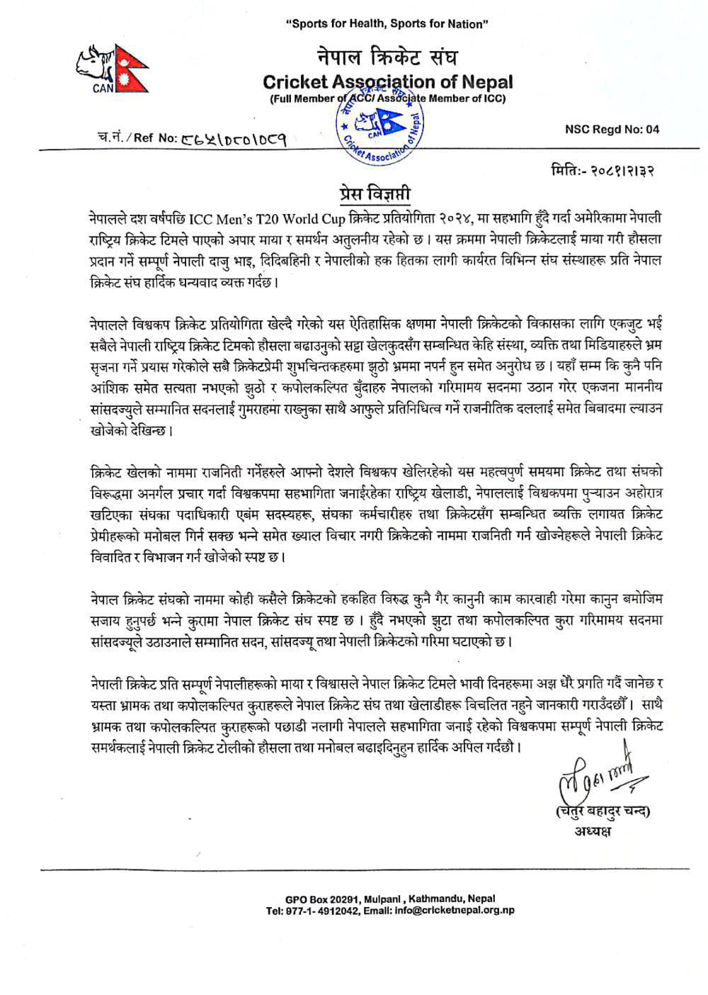 उनले क्रिकेटको नाममा राजनीति गर्न खोज्नेहरुले नेपाली क्रिकेट विवादित र विभाजन गर्न खोजेको समेत आरोप लगाएका छन्।