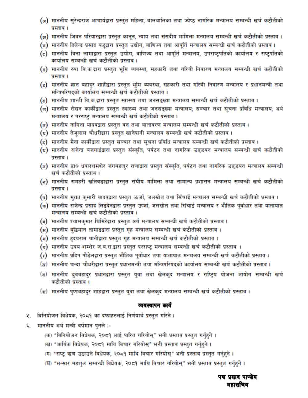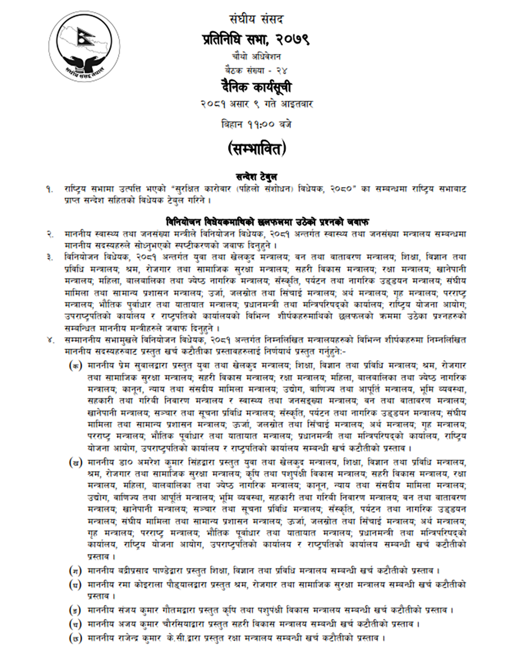 त्यस्तै विनियोजन विधेयक २०८१ का दफाहरूलाई निर्णयार्थ प्रस्तुत गरिने सम्भावित कार्यसूचीमा उल्लेख छ।