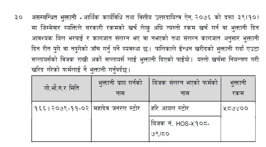तर, नगरपालिकाले इन्धन खरिदको भुक्तानी गर्दा एउटा सप्लायर्सको बियक राखेर अर्कै सप्लायर्सलाई भुक्तानी दिएको छ। २०७९ चैत २ मा काटिएको १६६ भौचर नम्बरको बिलमा भुक्तानी गर्नुपर्ने महादेव जनरल स्टोरलाई भए पनि हरि आयल स्टोरको बिजक नम्बर एचवएस(छज्ञणड(७९र८० राखेको पाइएको छ। उक्त बिजकमा ५ लाख ८७ हजार ४०० को बिल काटिएको छ।