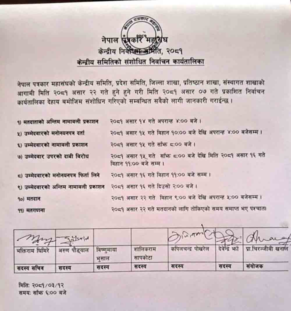 काठमाडौं। असार २२ गते हुने नेपाल पत्रकार महासंघको निर्वाचनको कार्यतालिकामा सामान्य हेरफेर भएको छ । महासंघले आज एक विज्ञप्ति जारी गर्दै कार्यतालिकामा परिवर्तन भएको जानकारी गराएको छ।