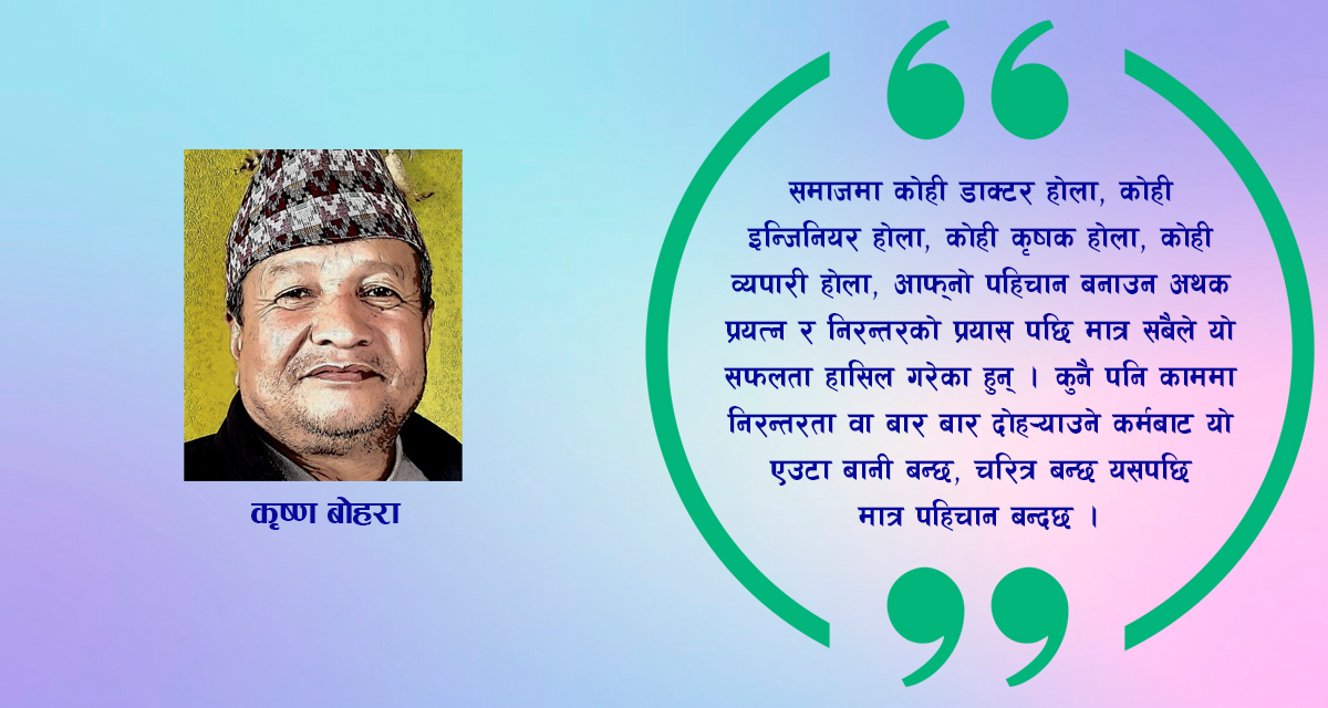 कुनै पनि काममा निरन्तरता वा बार बार दोहर्याउने कर्मबाट यो एउटा बानी बन्छ , चरित्र बन्छ यसपछि मात्र पहिचान बन्दछ।