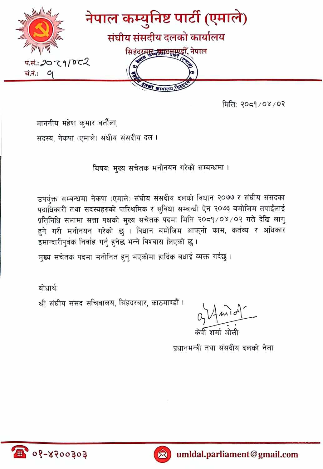 प्रधानमन्त्री तथा नेकपा एमाले संसदीय दलका नेता केपी शर्मा ओलीले बर्तौलालाई बुधवार मुख्य सचेतक पदमा मनोनयन गरेका हुन्।