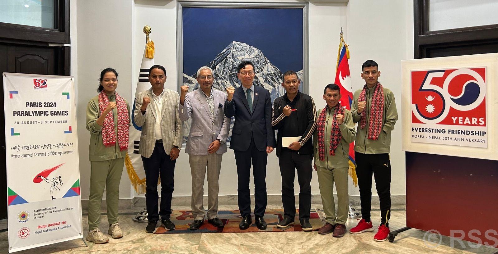 काठमाडौं। नेपालका लागि कोरियाली राजदूत पार्क थेयङले पारा ओलम्पिक २०२४ मा सहभागी हुन लागेका नेपाली खेलाडीलाई सफलताको कामनासहित बिदाइ गरेका छन्। सो प्रतियोगिता आगामी २८ अगस्टदेखि ८ सेप्टेम्बरसम्म फ्रान्सको पेरिसमा आयोजना हुँदैछ।