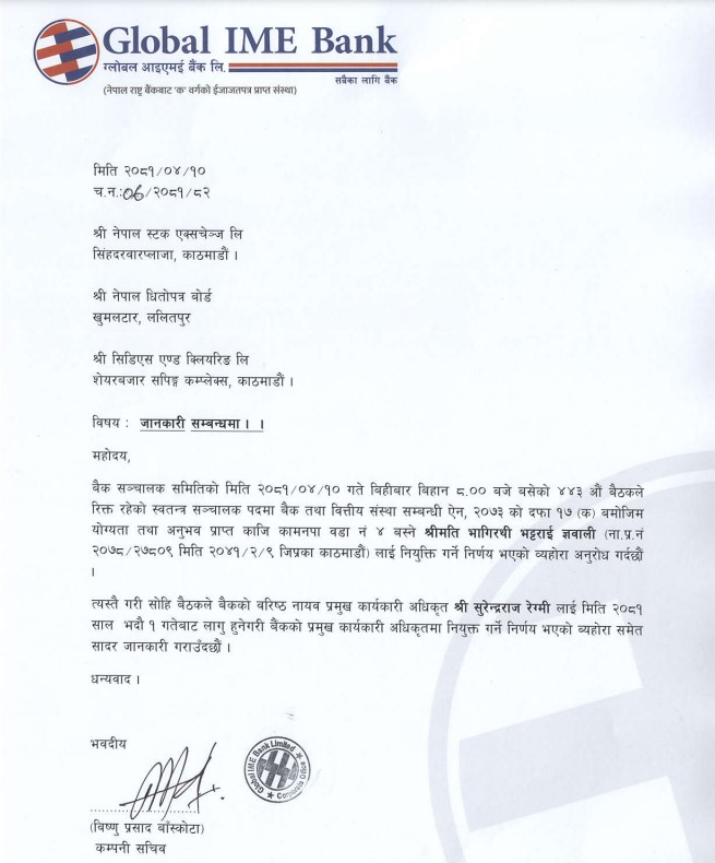 वरिष्ठ नायब सीईओ रहेका रेग्मीलाई सिइओमा नियुक्त गर्ने निर्णय गरेको कम्पनीका सचिव बिष्णुप्रसाद बाँस्कोटाले जनाएका छन्।