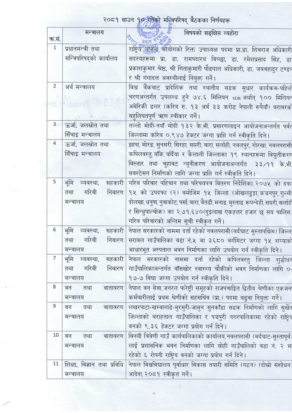 यी हुन् मन्त्रिपरिषद् बैठकका निर्णयहरु