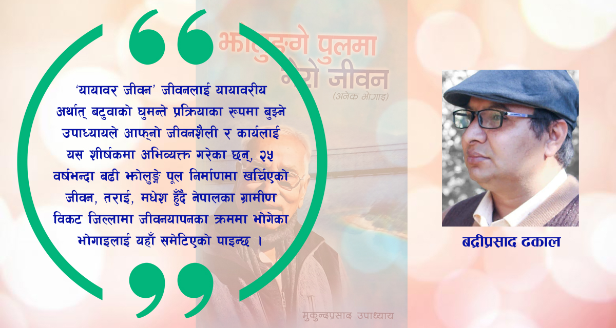 “देश नखाको छोरो र हिलो नखाको गोरु काम लाग्दैनन् बाबु। अझै म काम गर्न सक्तै छु। भातै पकाएर खाने काम त हो नि। तेरी आमा पनि त्यति त गरि हाल्छे। खनखाँचो मान्छे पनि पाइन्छन्। त्यही पनि उहिलेको जस्तो दुःख कहाँ छ र ?”
