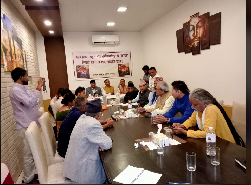 काठमाडौं। विनय यादव नेतृत्वको राष्ट्रिय एकता अभियानले आज राजधानीमा हिन्दुवादी संघ संस्थाका प्रतिनिधिहरुसँग छलफल गरी वंगलादेशमा हिन्दु र बौद्ध धर्मावलम्बीहरूमाथि भइरहेको हिंसाको विरोधमा एक संयुक्त संघर्ष समिति वनाई काठमाडौं स्थित वंगलादेश दुतावास अगाडी एक शसक्त विरोध प्रदर्शन गरिने जनाएको छ।