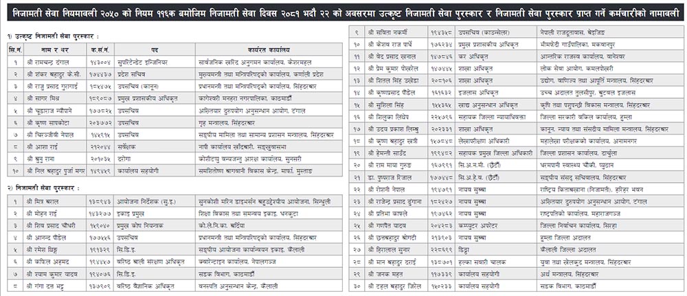 पुरस्कार पाउने कर्मचारीको सूचीः