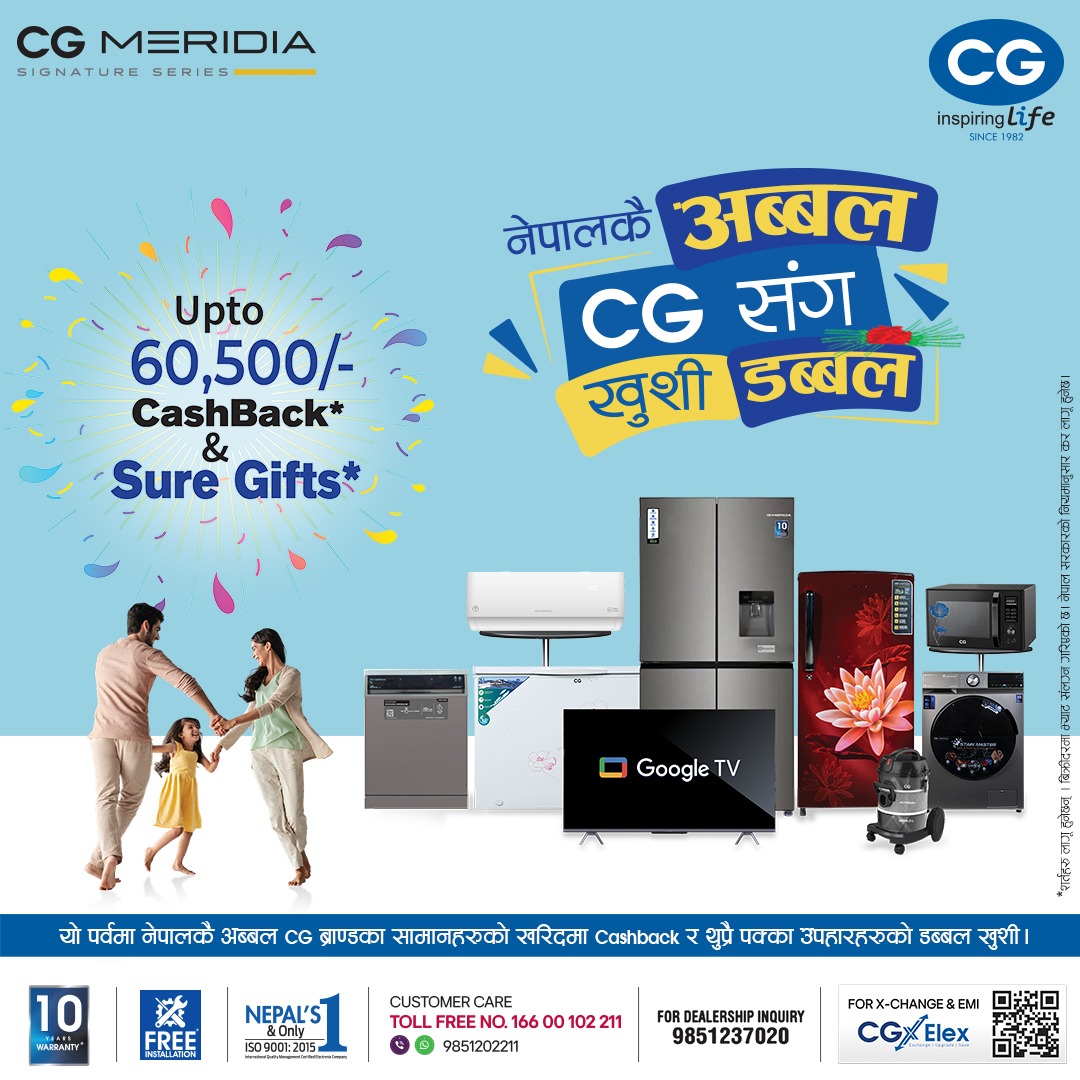 यस चाडपर्व अफरमा ग्राहकले सिजी टिभी (३२” देखि ५५” सम्म) खरिद गर्दा आकर्षक क्यासब्याक प्राप्त गर्न सक्नेछन्।