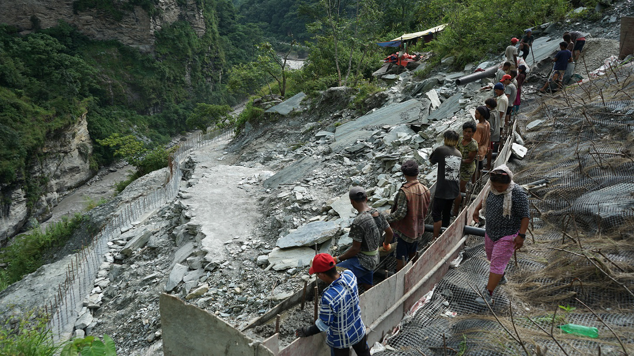 “ भिरमा ड्रिल गरेर प्याल पारी रड राख्ने र ढलान गरिएको हो”, उनले भने, “पिठ्युमा निर्माण सामग्री ओसारेर पहिरोको जोखिमयुक्त भिरमा दैनिक ३० जना मजदुरले करिब दुई महिना लगाएर एङ्करिङ र नेलिङ गर्ने काम अन्तिम चरणमा पुगेको छ ।” भूमिगत पानीका कारण सिर्जना भएको पहिरो रोकथामका लागि आयोजनाले गत वर्ष खोल्साको पानीले बगाएपछि केही समय रोकिएको पहिरो यसपालिको बर्खाको सुरु भएसँगै पुनः खस्न थालेको थियो ।