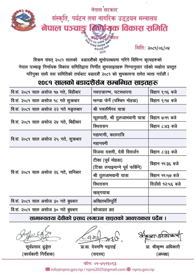 यस्तै असोज १७ गते बिहान ९ बजेर १६ मिनेटमा घटस्थापनाको साइत रहेको सूचनामा उल्लेख छ। असोज १८ गते बिहान ९ बजेर १४ मिनेटमा पश्चिम फर्किएर फेर्ने साइत छ। असोज २२ गते पचलीभैरव यात्रा र २४ गते फूलपाती छ। फूलपाती भित्राउने शुभसाइत बिहान ७ बजेर ११ मिनेटमा छ।