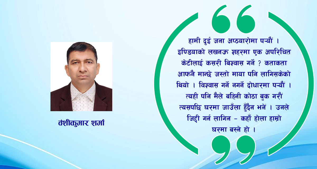 भारतको लखनउमा एक अपरिचित केटीलाई कसरी बिश्वास गर्ने? कताकता आफुनै मान्छे जस्तो माया पनि लागिसकेको थियो। बिश्वास गर्ने नगर्ने दोधारमा पर्यौं। त्यही पनि मैले बहिनी कोठा बुक गरौं त्यस पछि घरमा जाउँला हुदैन भनेँ। उनले जिद्दी गर्न लागिन्‘ कहाँ हाम्रो घरमा बस्ने हो। पापाआमा रिसाउनु हुन्छ।’