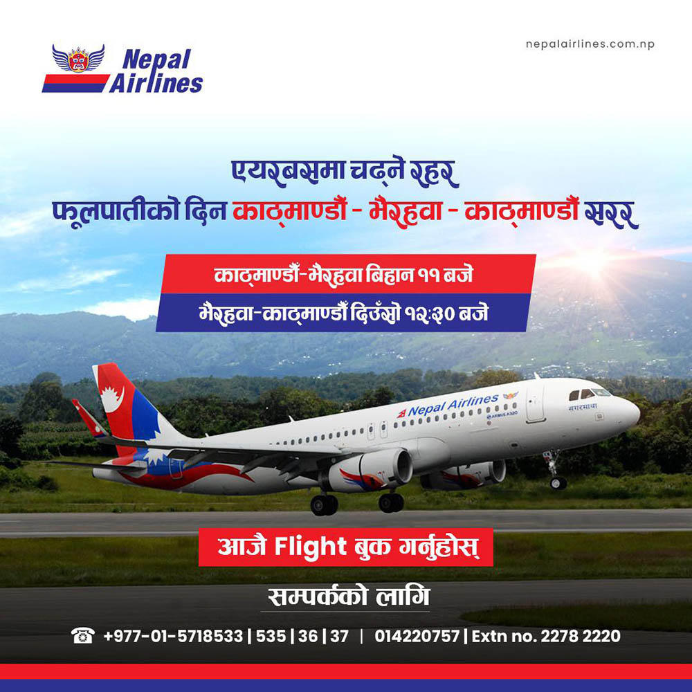काठमाडौं। नेपाल एयर लाइन्सले फूलपातीको दिन काठमाडौं–भैरहवा–काठमाडौं उडान गर्ने भएको छ।