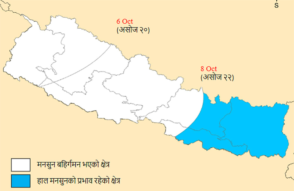 मौसम पूर्वानुमान महाशाखाका अनुसार काठमाडौं उपत्यकासहित बागमती प्रदेश, कर्णाली प्रदेश, लुम्बिनी प्रदेश र गण्डकी प्रदेशका सम्पुर्ण भू–भागबाट मनसुन बाहिरिएको हो।