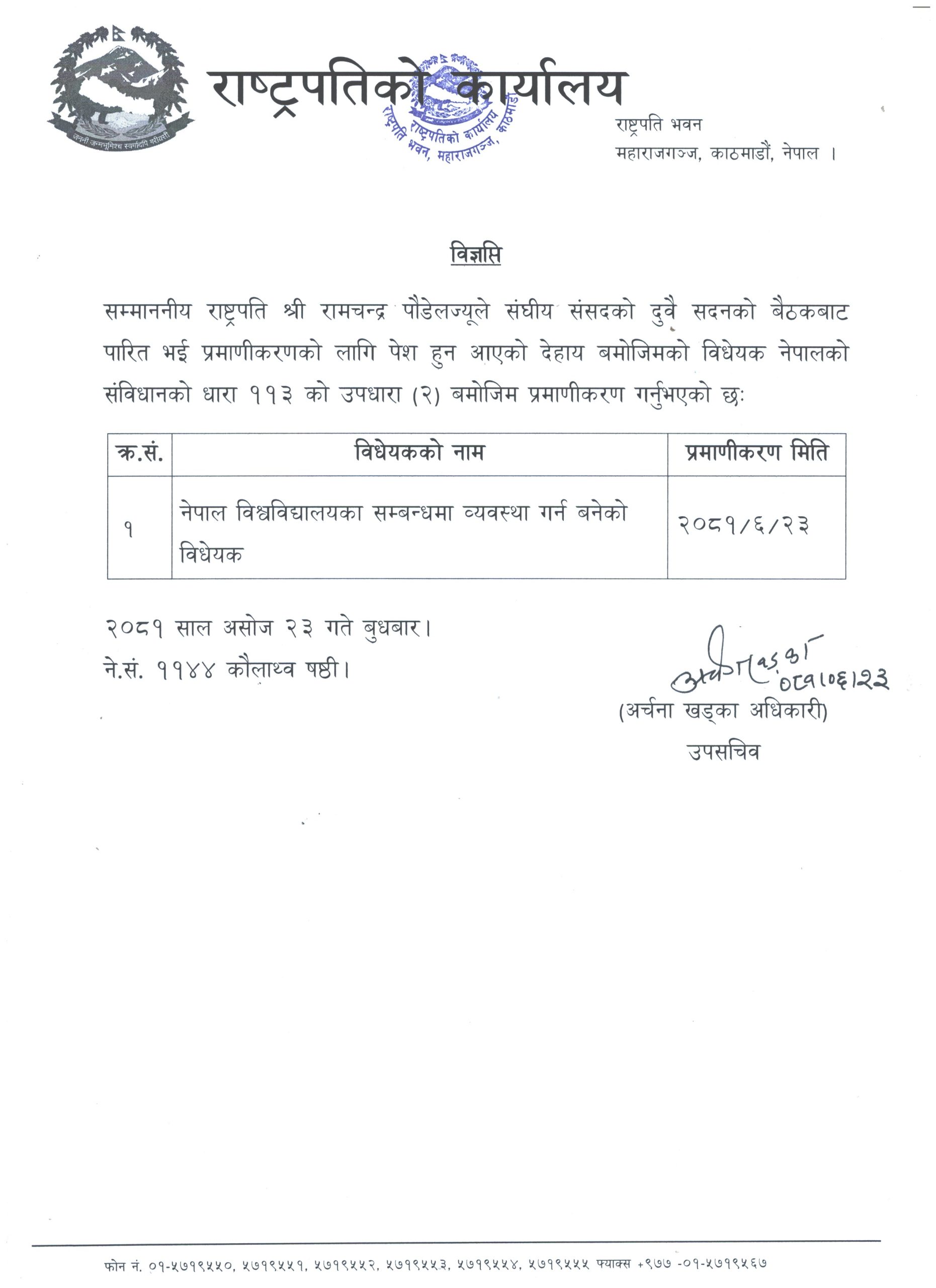 राष्ट्रपति पौडेलद्वारा नेपाल विश्वविद्यालयसम्बन्धी विधेयक प्रमाणीकरण