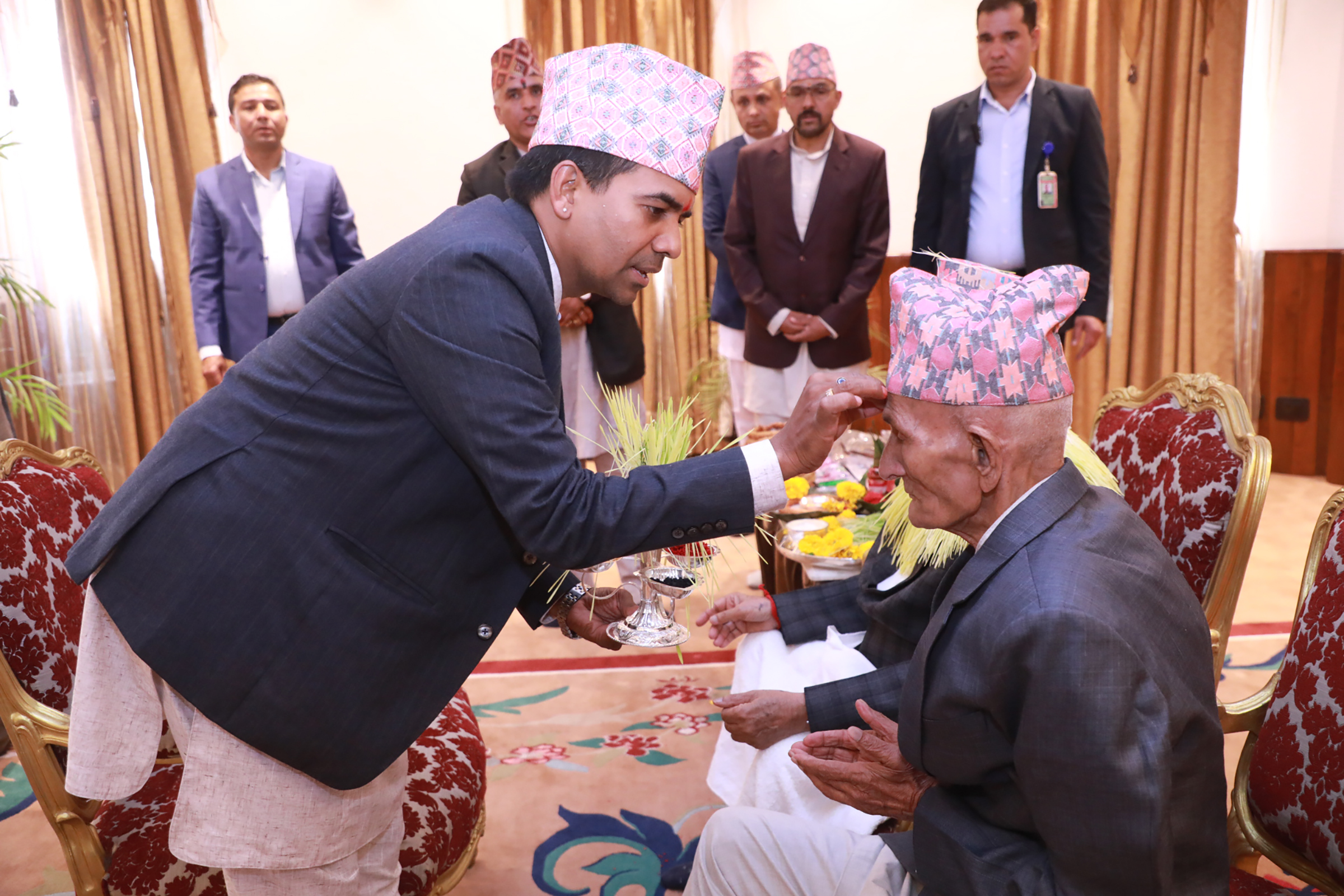 काठमाडौं। राष्ट्रपति रामचन्द्र पौडेलले ९४ वर्षिय दाजु डुण्डीराज पौडेलबाट शुभ साइतमा यस वर्षको दसैँको टीका, प्रसाद, जमरा र आशिर्वाद ग्रहण गरेका छन्। सोही अवसरमा राष्ट्रपति पौडेलले गुरु पुरोहितबाट पनि दसैँको टीका, जमरा र प्रसाद ग्रहण गरे।