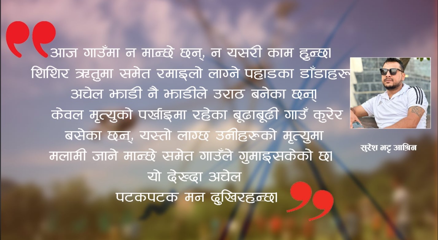 शिशिर ऋतुमा समेत रमाइलो लाग्ने पहाडका डाँडाहरू अचेल झाडी नै झाडीले उराठ बनेका छन्। केवल मृत्युको पर्खाइमा रहेका बूढाबूढी गाउँ कुरेर बसेका छन्, यस्तो लाग्छ उनीहरुको मृत्युमा मलामी जाने मान्छे समेत गाउँले गुमाइसकेको छ। यो देख्दा अचेल पटकपटक मन दुखिरहन्छ।