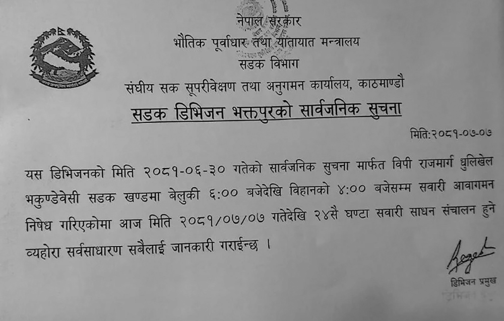 सडक डिभिजन कार्यालय भक्तपुरका अनुसार बुधवारदेखि राजमार्ग २४ सै घण्टा सुचारु गरिएको छ। यसअघि असोज ३० देखि राजमार्गको धुलिखेल–भकुण्डेवेशी सडक खण्डमा रातिको समयमा सवारी सञ्चालनमा रोक लगाइएको थियो।