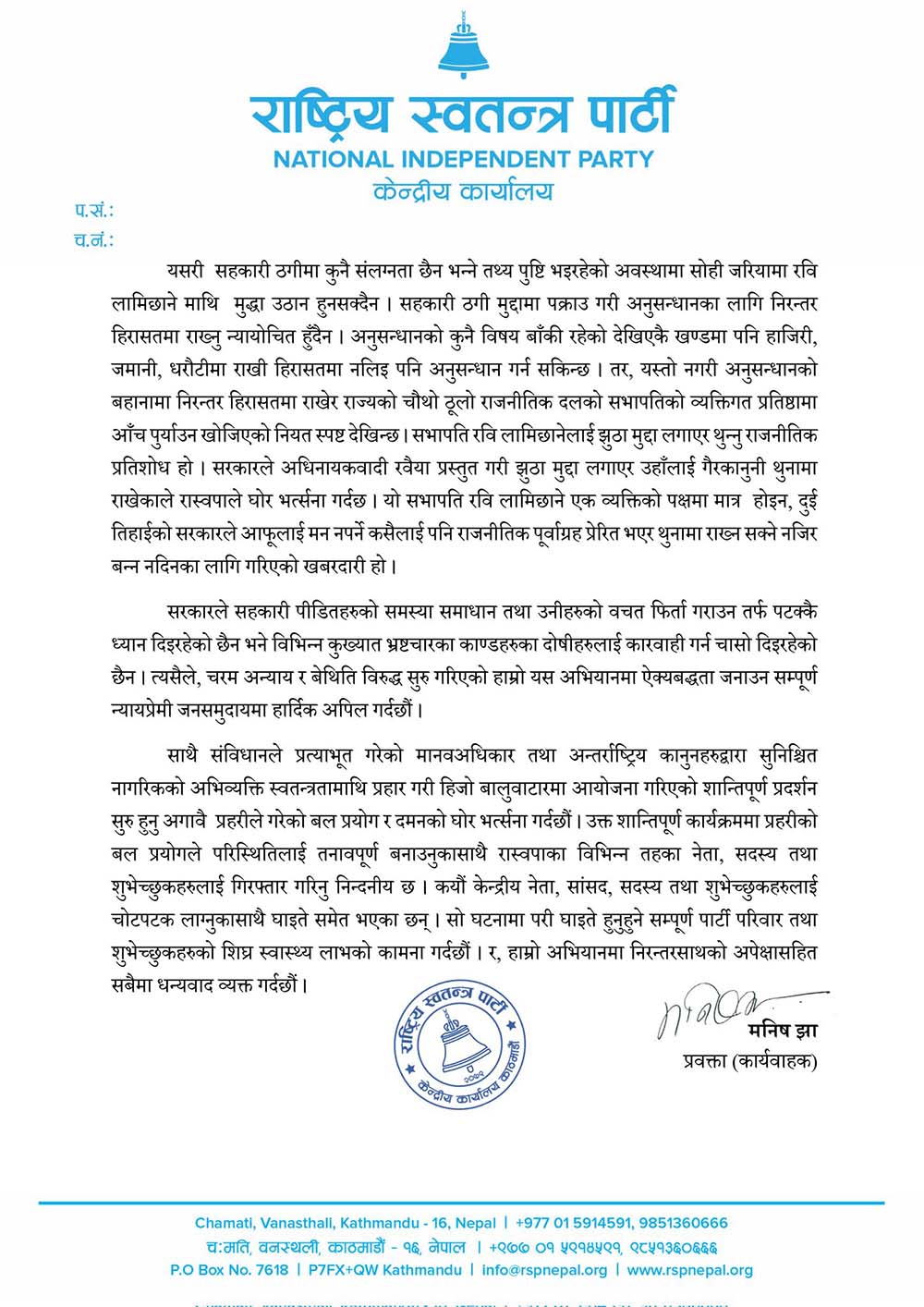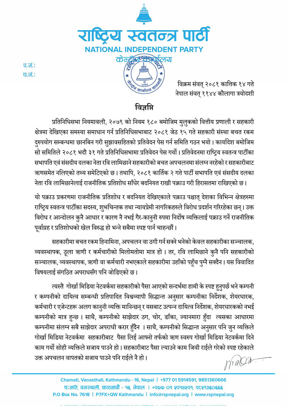 बुधबार एक विज्ञप्ति जारी गर्दै रास्वपाले रवि लामिछानेले सहकारीको रकम गोरखा मिडियामा ल्याउने प्रक्रियामा संलग्न नरहेकोले उनी दोषी नरहेको दोहोर्याएको छ।