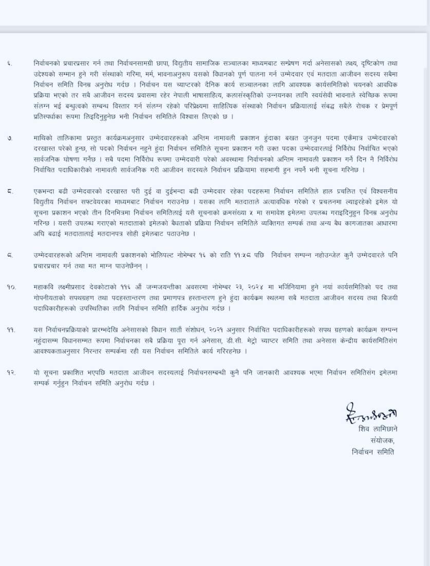 निर्वाचन समितिमा परशु तिमल्सिना र पुष्पा घिमिरे सदस्य रहेका छन्। निर्वाचन समितिले मंगलबारकाे बैठकले आगामी नोभेम्बर १८ मा डिसी मेट्रो च्याप्टर कार्यसमितिको निर्वाचन गर्नका लागि निर्वाचनको कार्यतालिकासहित पहिलो सूचना सार्वजनिक गरेको छ।