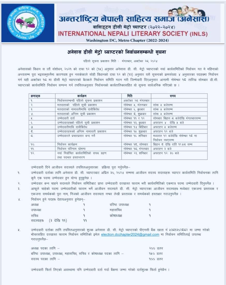 अमेरिका। अन्तर्राष्ट्रिय नेपाली साहित्य समाज, वासिङ्टन डिसी मेट्रो च्याप्टरको नयाँ कार्यसमितिको निर्वाचन आगामी नोभेम्बर १८ तारिख सोमबार हुने भएको छ।