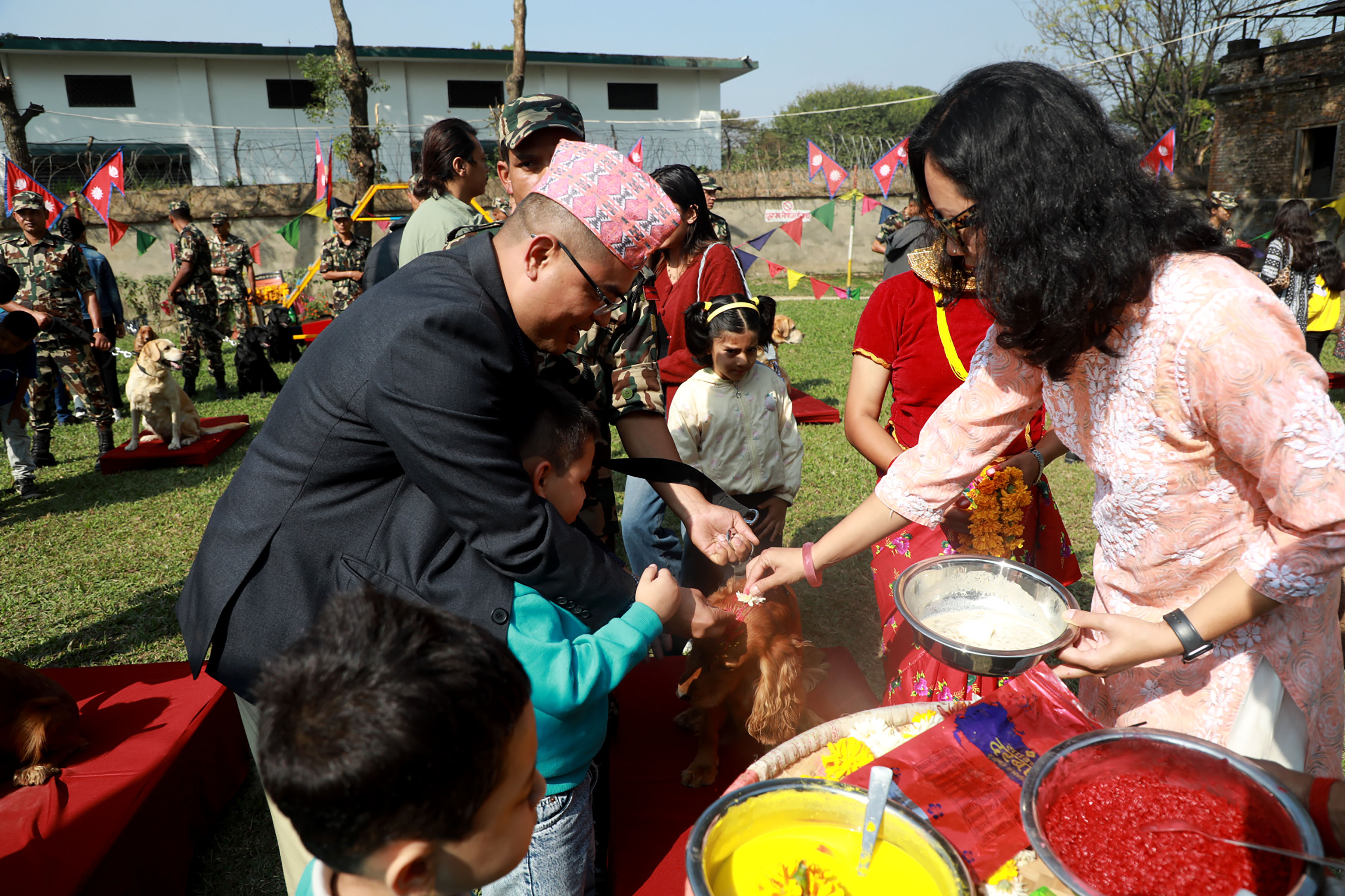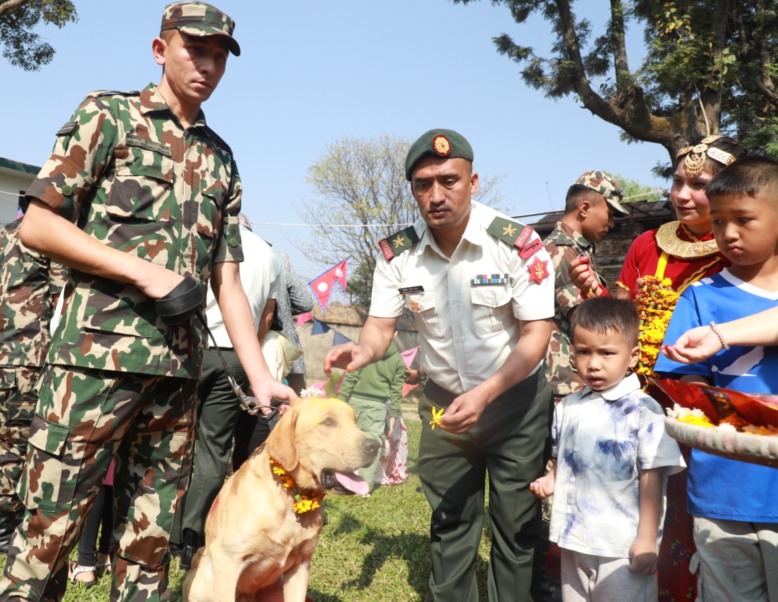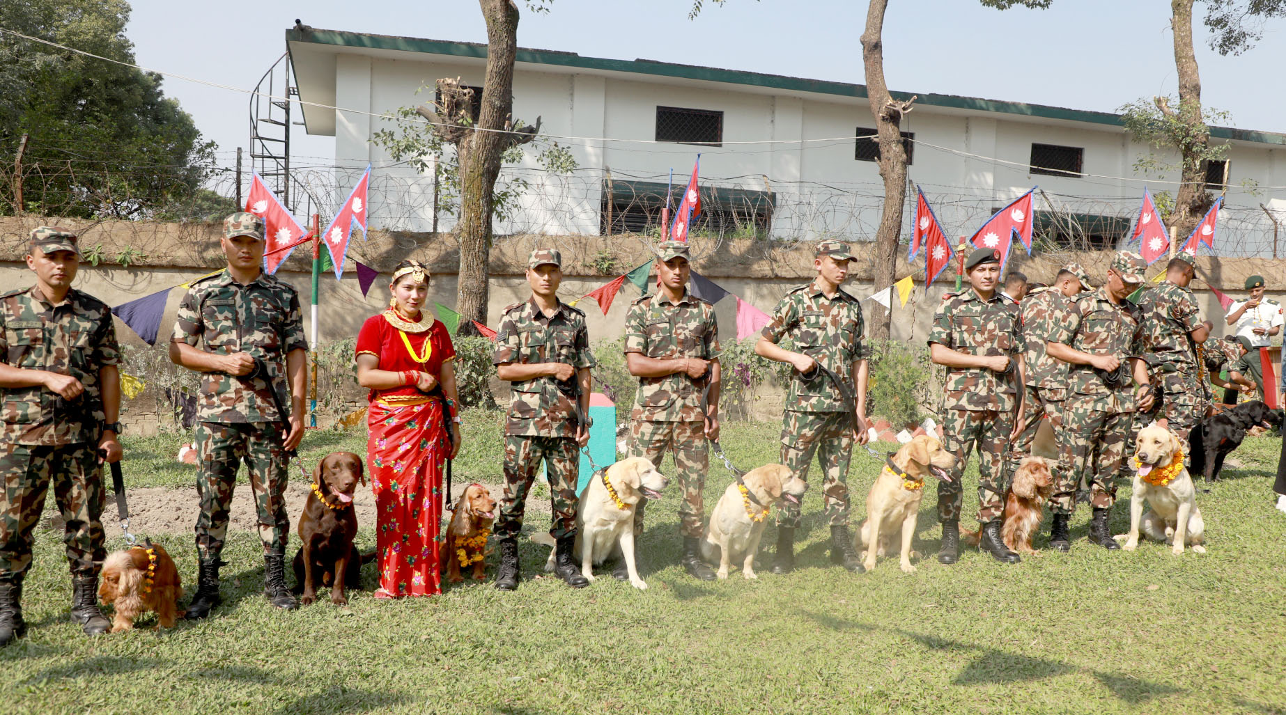 तस्वीरमा हेर्नुहोस् कुकुर तिहारको अवसरमा नेपाली सेनाका प्रशिक्षित कुकुरहरूको पूजा
