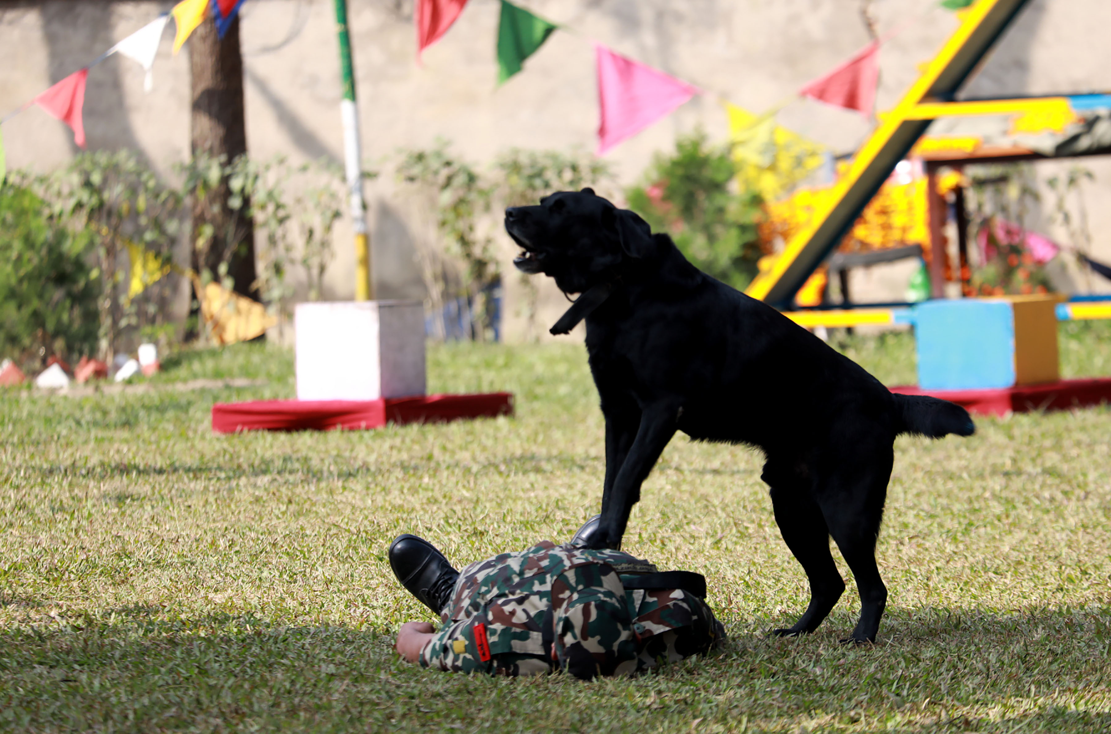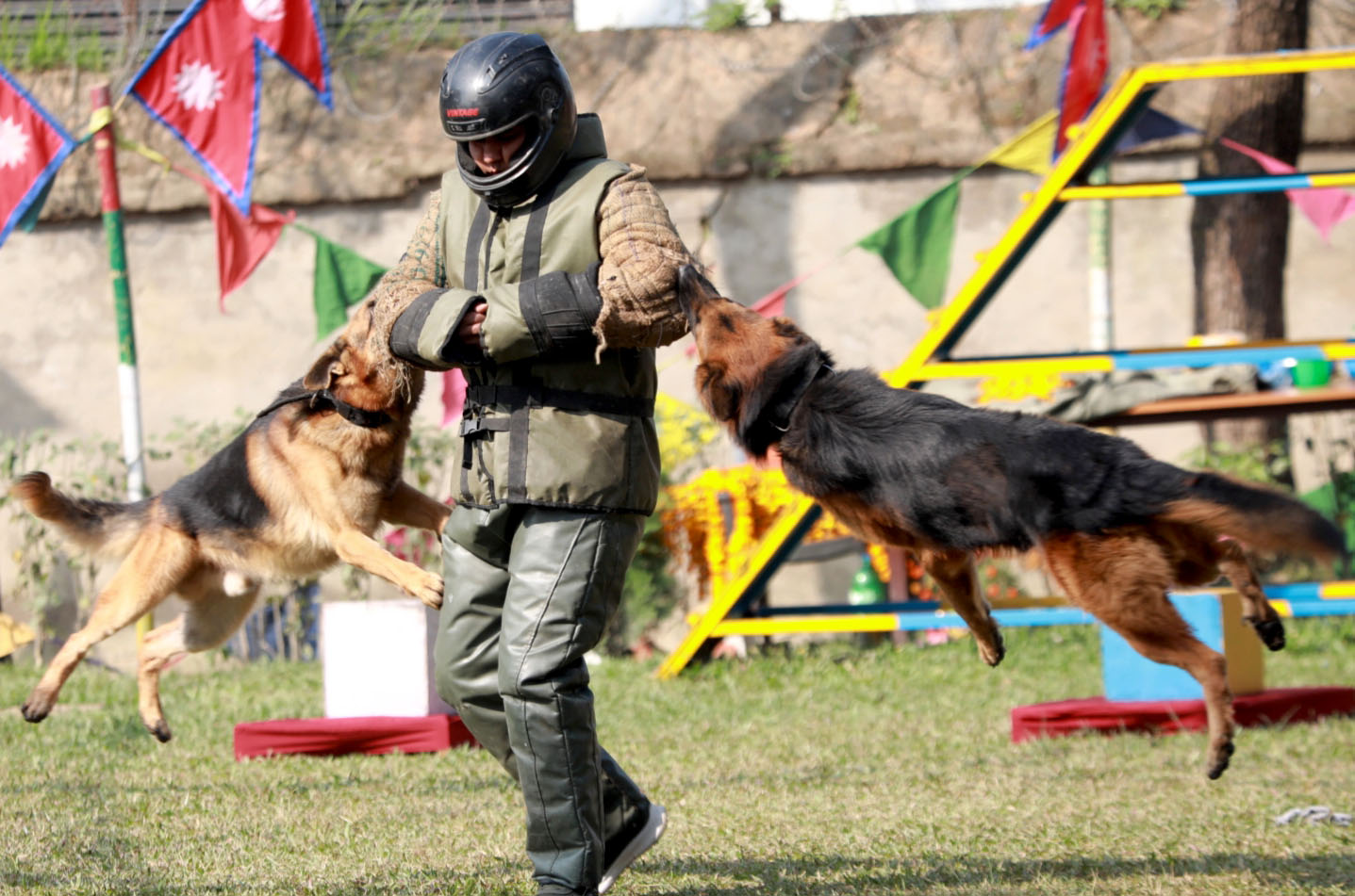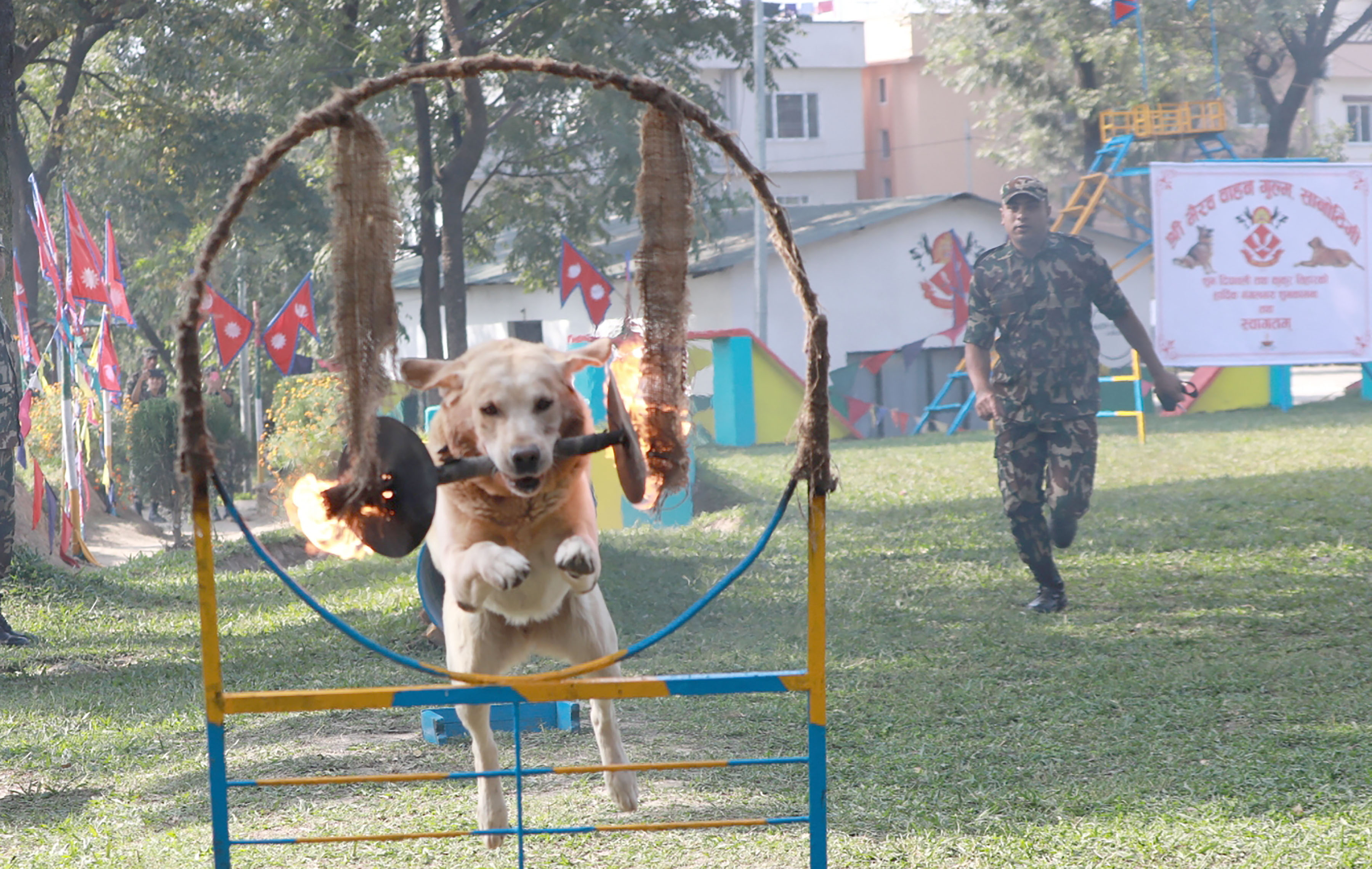 तस्वीरमा हेर्नुहोस् कुकुर तिहारको अवसरमा नेपाली सेनाका प्रशिक्षित कुकुरहरूको पूजा