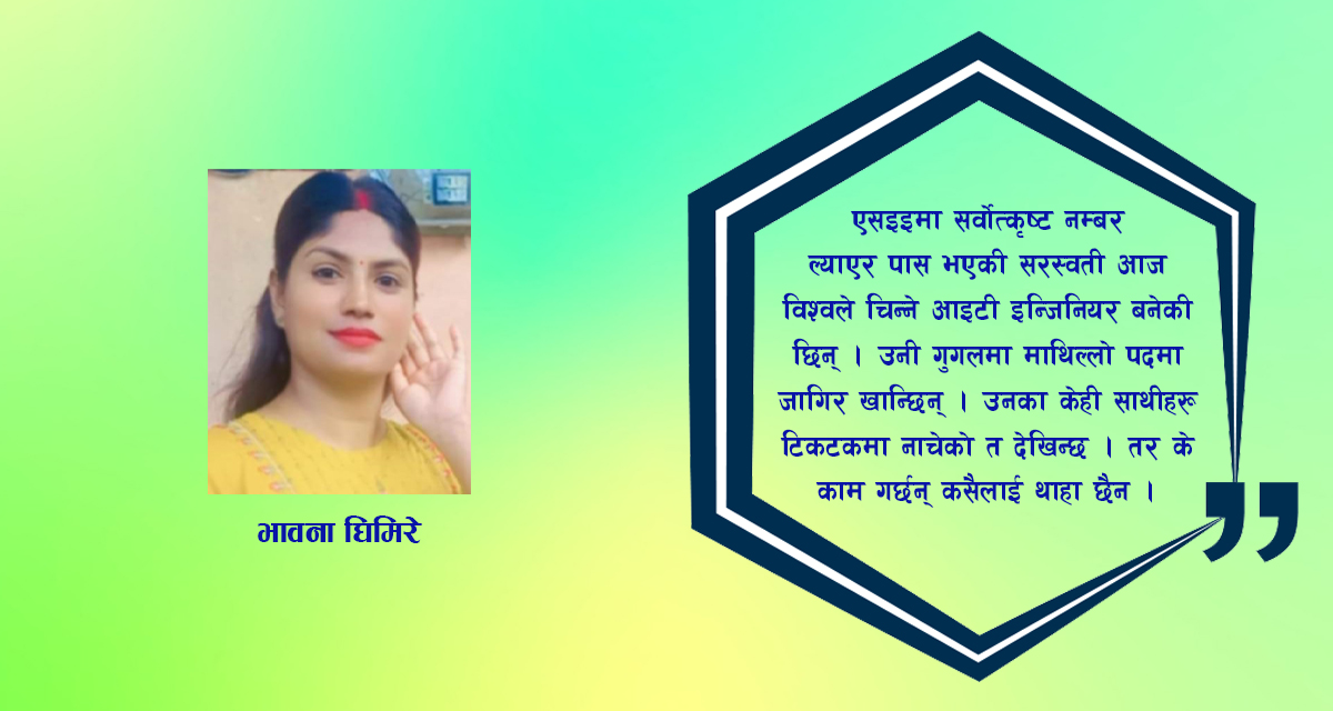 एसईईमा सर्वोत्कृष्ट नम्बर ल्याएर पास भएकी सरस्वती आज विश्वले चिन्ने आईटी इन्जिनियर बनेकी छिन् । उनी गुगलमा माथिल्लो पदमा जागिर खान्छिन् । उनका केही साथीहरू टिकटकमा नाचेको त देखिन्छ । तर के काम गर्छन् कसैलाई थाहा छैन ।