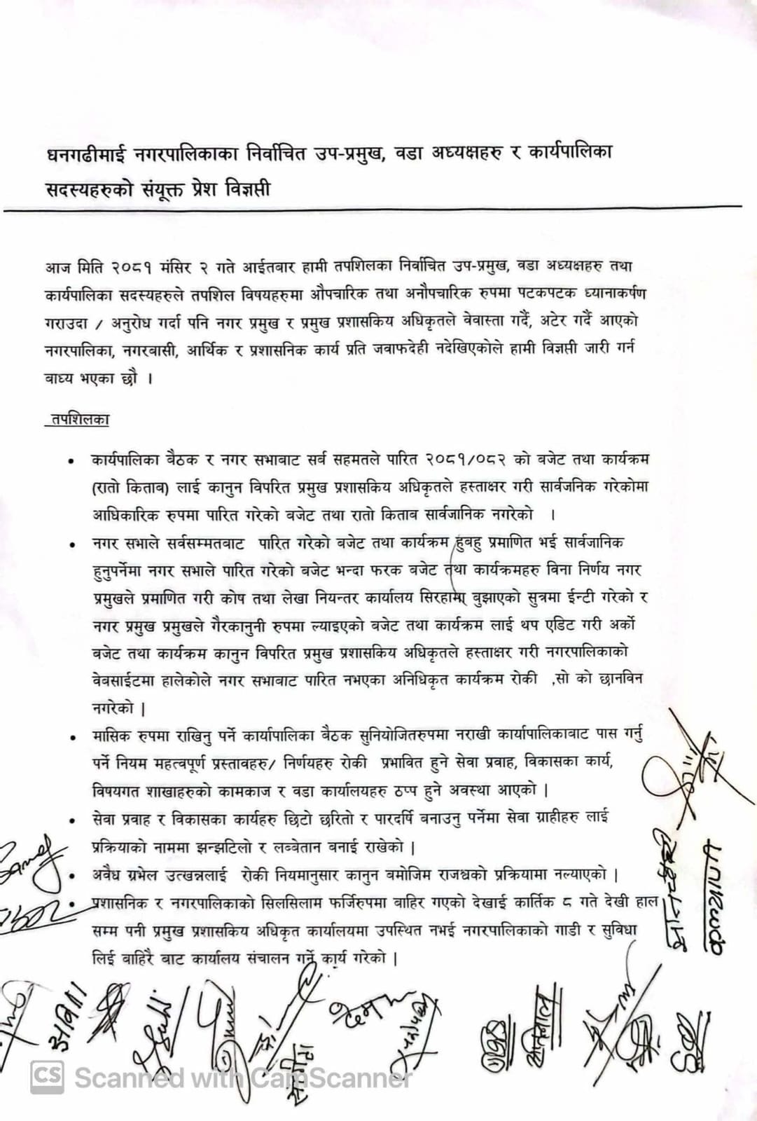 नगर प्रमुख शिवशंकर महतो र प्रमुख प्रशासकीय अधिकृत माधवेन्द्र चौधरीले आफ्नो अनुकूलको बजेट बनाएर सूत्रमा हाल्ने र नगरपालिकाको आधिकारिक वेबसाइटमा सार्वजनिक गरेको विषय तत्काल छानबिनसहितको माग गर्दै १९ जना कार्यपालिका सदस्यले विज्ञप्ति जारी गरेर विरोध जनाएका हुन्।