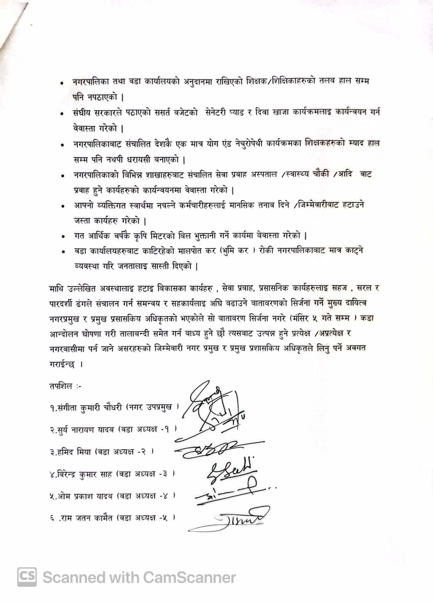 उनीहरूले नगरपालिकाको बेथिति, विसंगति र अनियमितताजस्ता कार्य तत्काल नरोकिए मंसिर ५ गते पछि कडा आन्दोलन घोषणा गरी तालाबन्दी समेत गर्न बाध्य हुने चेतावनी दिएका छन्।